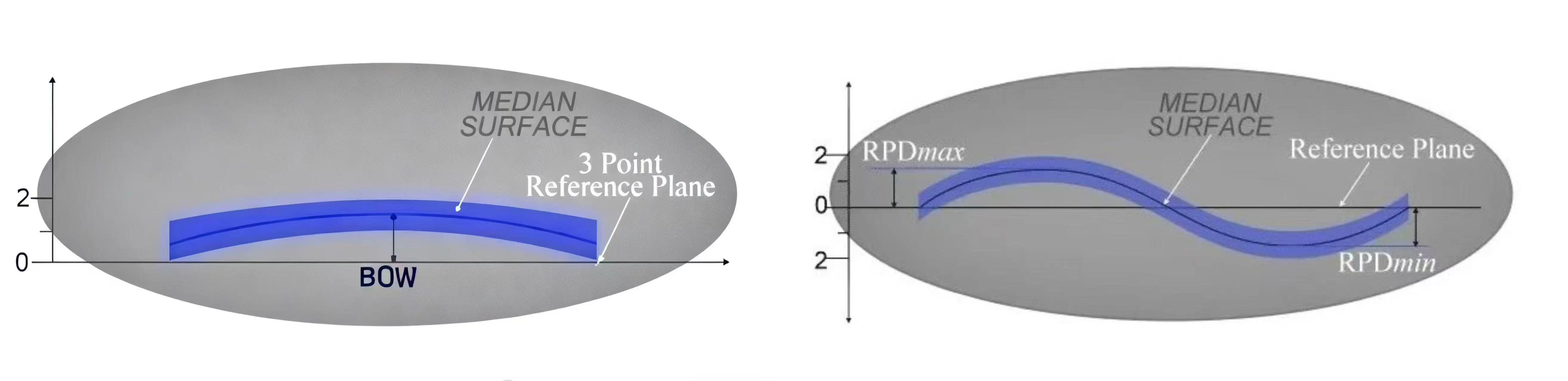 The bow indicator focuses on the vertical offset of the wafer center area, which only reflects the local bending state. It is suitable for evaluating scenarios that are sensitive to local flatness. The warp indicator is useful for assessing overall flatness and distortion because it considers the deviation of the entire wafer surface and provides information on overall flatness for the entire wafer.