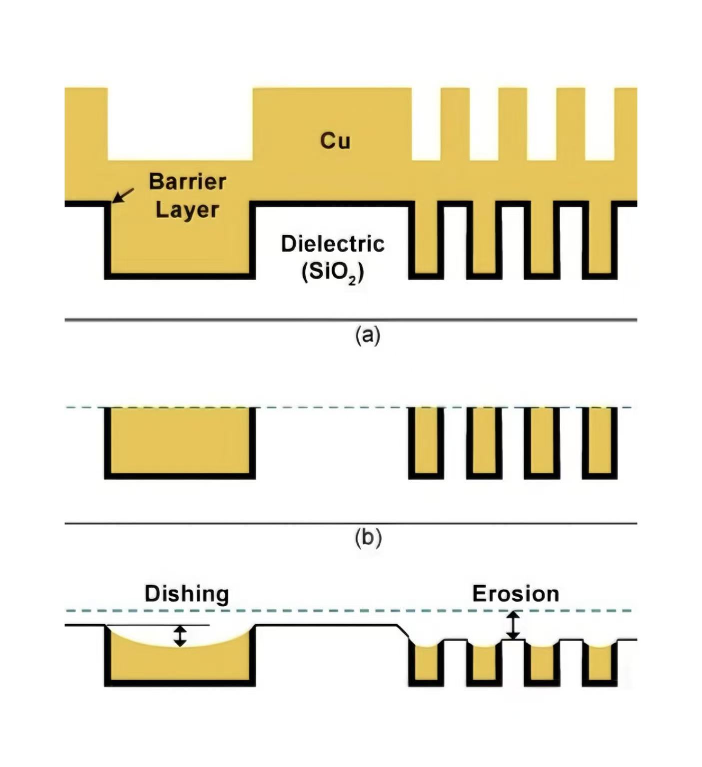 Chemical mechanical polishing (CMP), which combines chemical corrosion and mechanical polishing to remove surface imperfections, is the significant semiconductor process for achieving overall planarization of the wafer surface. CMP results in two surface defects, dishing and erosion, which significantly impact the flatness and electrical performance of interconnect structures.
